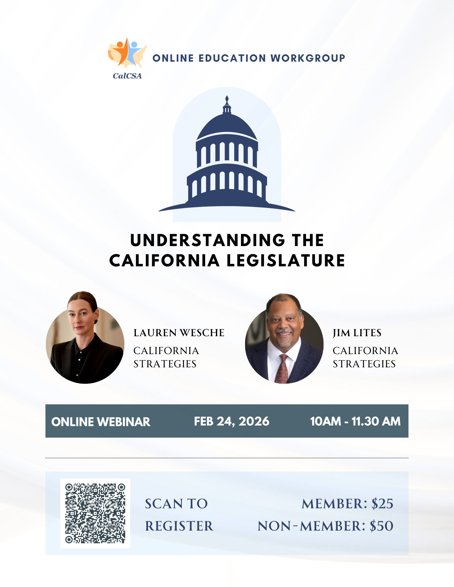 Join us for an insightful session on the California Legislature, presented by Lauren Wesche and Jim Lites of California Strategies & Advocacy, two leading experts in state policy and legislative advocacy. This session will provide a timely overview of the legislative landscape in California.